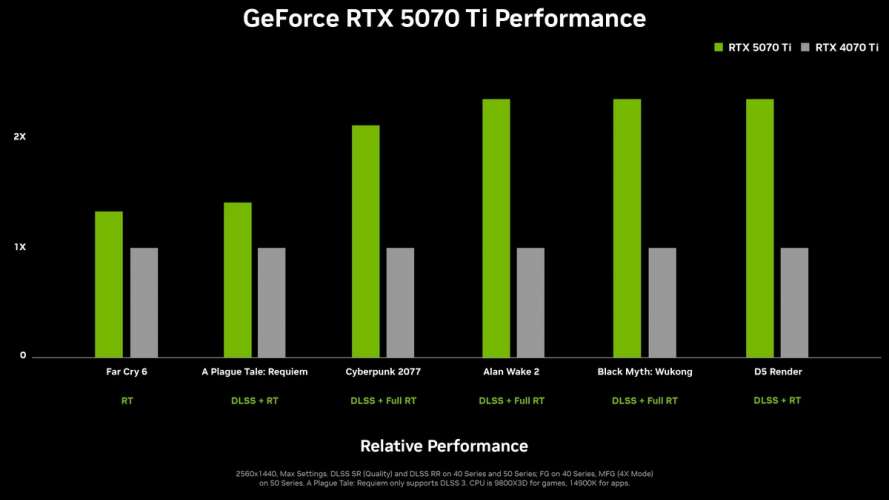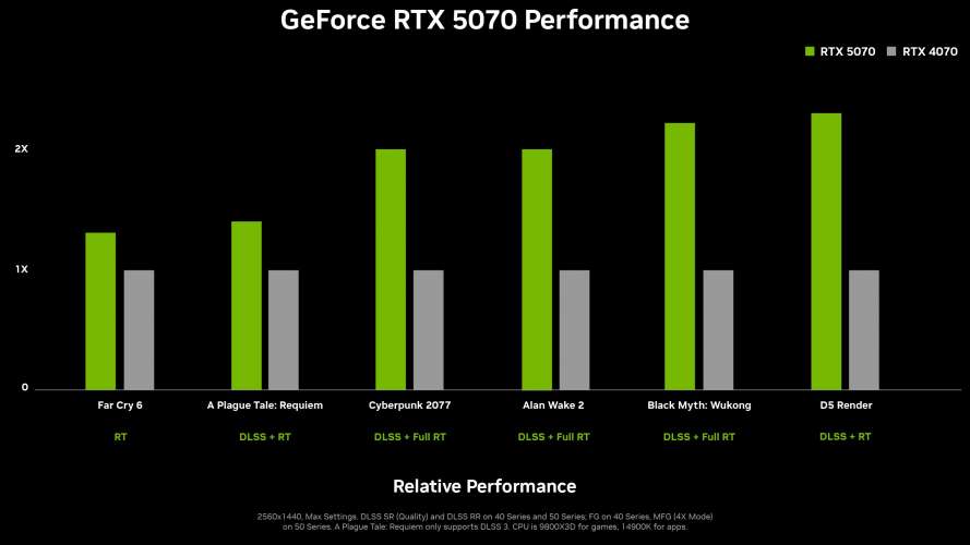 Nvidia анонсировала свою новую линейку графических процессоров, серию RTX 50. Она включает четыре новые видеокарты: RTX 5090, RTX 5080, RTX 5070 Ti и RTX 5070. Nvidia обещает огромные скачки производительности благодаря новым возможностям искусственного интеллекта DLSS 4 . Продажи RTX 5090 и RTX 5080 по цене $2000 и $1000 стартуют в январе этого года, а RTX 5070 Ti и RTX 5070 за $750 и $550 — в феврале. RTX 5080 должна стать в два раза быстрее RTX 4080. Она получит 16 ГБ видеопамяти и 10 752 CUDA-ядра при мощности в 360 Вт. RTX 5070 Ti комплектуется 16 ГБ GDDR7 и 8960 CUDA-ядрами, а RTX 5070 — 12 ГБ GDDR7 и 6144 CUDA-ядрами. TDP последних двух моделей составит 300 Вт и 250 Вт. Производитель указывает, что RTX 5070 Ti и RTX 5070 должны двукратно превосходить по скорости RTX 4070 Ti и RTX 4070. Nvidia вовсе заявил, что RTX 5070 обеспечит производительность RTX 4090.