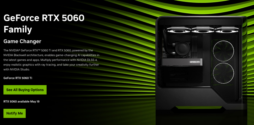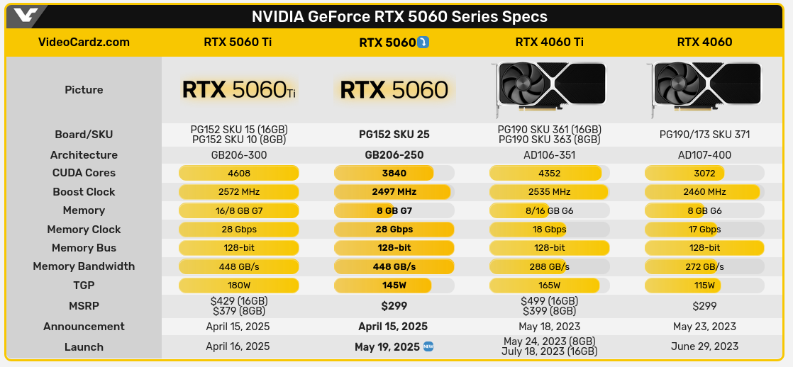 6 мая 2025 года Nvidia представила бюджетную видеокарту GeForce RTX 5060 за $300. Релиз GeForce RTX 5060 запланирован на 19 мая, в тот же день в розничных сетях появятся игровые ноутбуки с RTX 5060. В составе RTX 5060 используется графический процессор GB206 с 3840 ядрами CUDA, что на 800 меньше, чем у RTX 5060 Ti. Карта получила 8 Гбайт памяти GDDR7 с поддержкой 128-битной шины. Пропускная способность памяти составляет 448 Гбайт/с. У той же RTX 4060 пропускная способность памяти составляет 288 Гбайт/с. Nvidia заявляет, что RTX 5060 поддерживает все современные технологии, включая мультикадровый генератор и DLSS 4, что и старшие модели карт RTX 50-й серии. Благодаря этому она обеспечивает до двух раз больше производительности по сравнению с RTX 4060 предыдущего поколения и ещё больше по сравнению с GeForce GTX 1660 и GeForce RTX 2060.